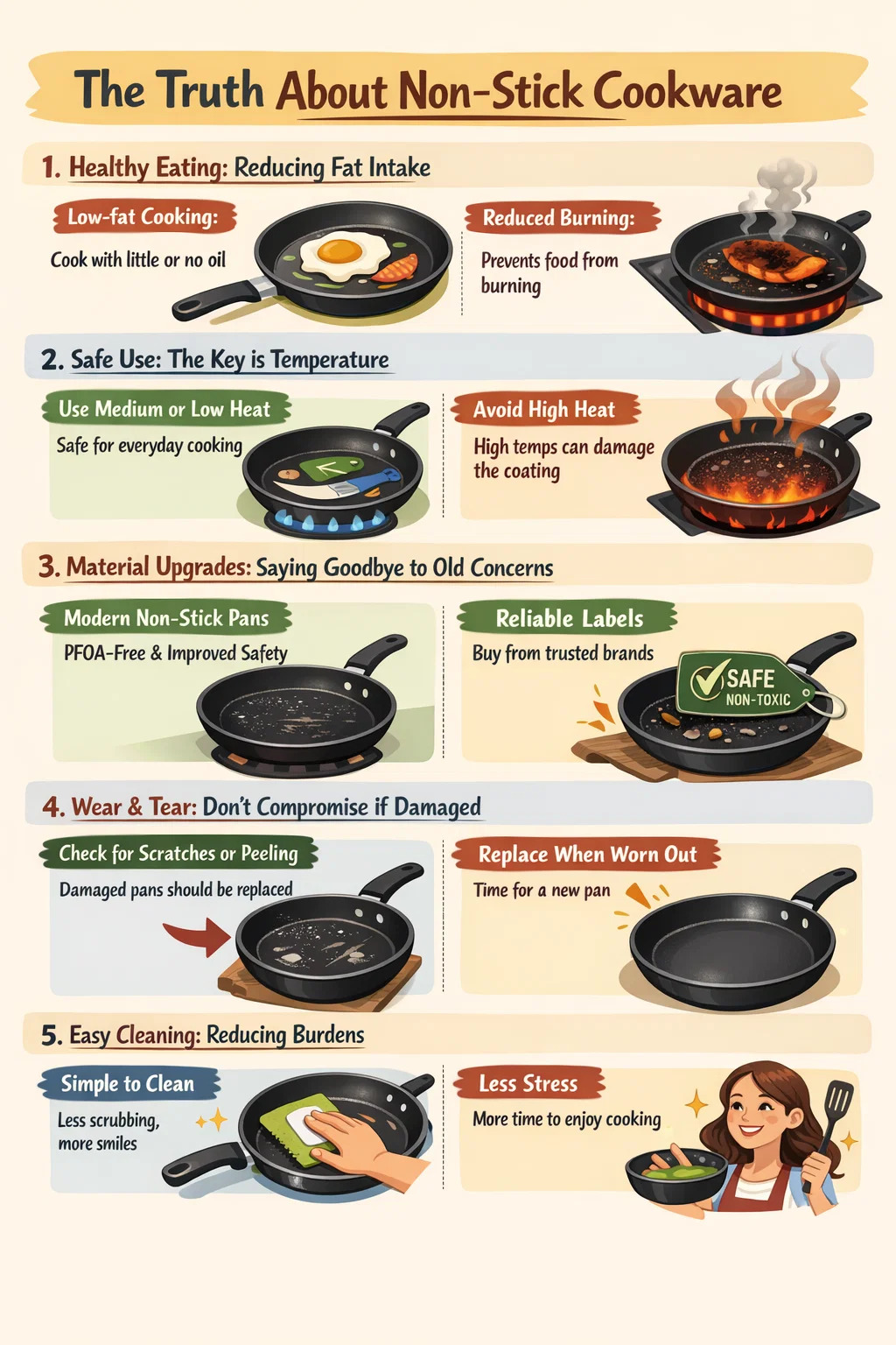 Säästä aikaa ja vaivaa: Vaikka keittiön ilmapiiri ruoanlaitossa on sydäntä lämmittävä, kattiloiden ja pannujen peseminen on fyysisesti vaativaa. Tarttumattomat astiat on erittäin helppo puhdistaa; nopea huuhtelu ja pyyhintä liinalla riittää. Kotitöiden vähentäminen parantaa mielialaa ruoanlaiton aikana, ja tämä psyykkinen helppous on myös eräänlainen terveyden muoto.