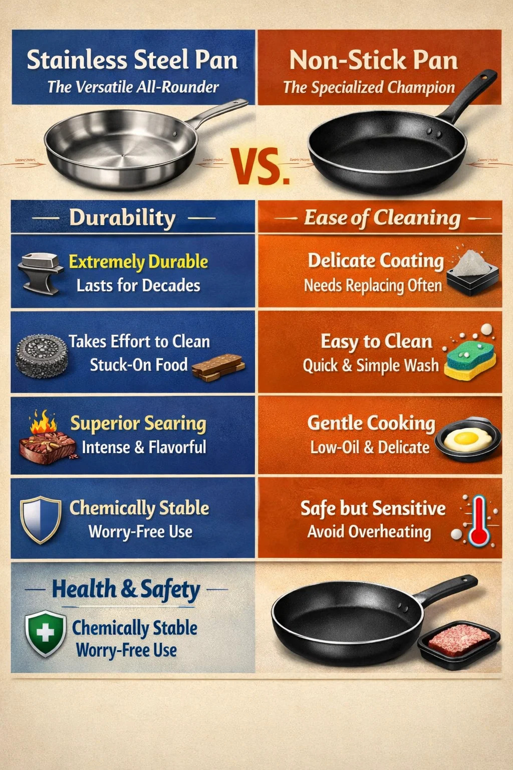 Keittoastioita valittaessa ruostumattomalla teräksellä ja tarttumattomilla pannuilla on kullakin omat etunsa. Niissä ei ole kyse siitä, että toinen korvaa toista, vaan pikemminkin "monipuolinen all-rounder" ja "erikoismestari" keittiössä.
