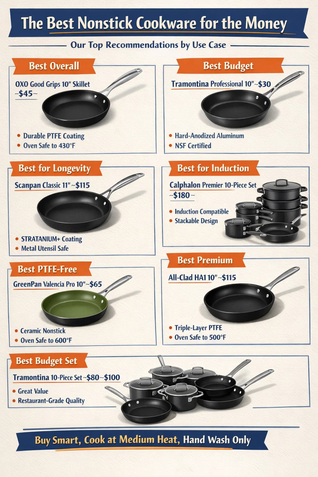 Tarttumattomien keittiövälineiden markkinat palkitsevat älykkäät ostokset ylihintaisten kulujen sijaan. Käytä 40–80 dollaria Tramontinan, OXO:n tai Calphalonin valmistamaan hyvin rakennettuun PTFE-pannuun, huolehdi siitä kunnolla ja vaihda se, kun pinnoite on kulunut. on kustannustehokkaampi ja käytännöllisempi strategia kuin kuluttaa 200 dollaria "ikuiseen pannuun", joka on edelleen riippuvainen lopulta kuluvasta pinnoitteesta. Osta älykkäästi, kypsennä keskilämmöllä, pese käsin, jätä suihkuöljy väliin, niin hyvä tarttumaton pannu palvelee sinua vuosia.