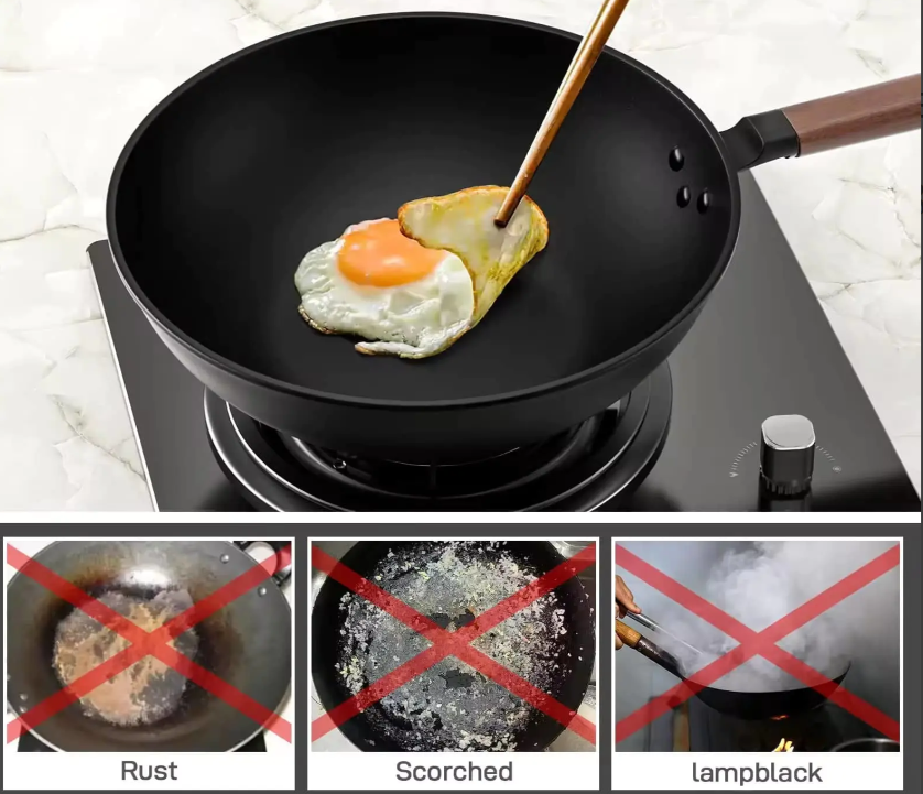 Oikea menetelmä: Pidä tietty määrä rasvaa tai ruokaa potissa kypsennyksen aikana ja hallitse tulta keskipitkällä tai matalalla (induktiokeitin suositellaan ≤1600W).